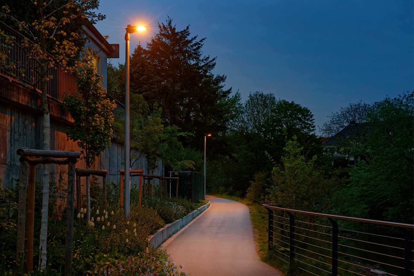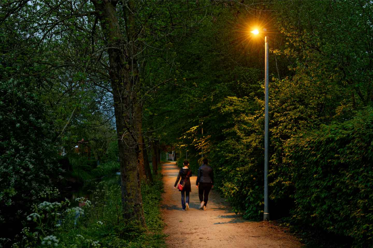 Gestionate de sistemul de control Schréder EXEDRA, aparatele de iluminat au fluxul luminos redus atunci când traseul nu este utilizat. Datorită senzorilor de mișcare, lumina crește la 100% doar atunci când oamenii sosesc, pentru a asigura o trecere sigură și confortabilă. Deoarece luminile stradale sunt aprinse complet doar pentru perioade limitate de timp, orice poluare luminoasă potențială a fost redusă în mod dramatic.